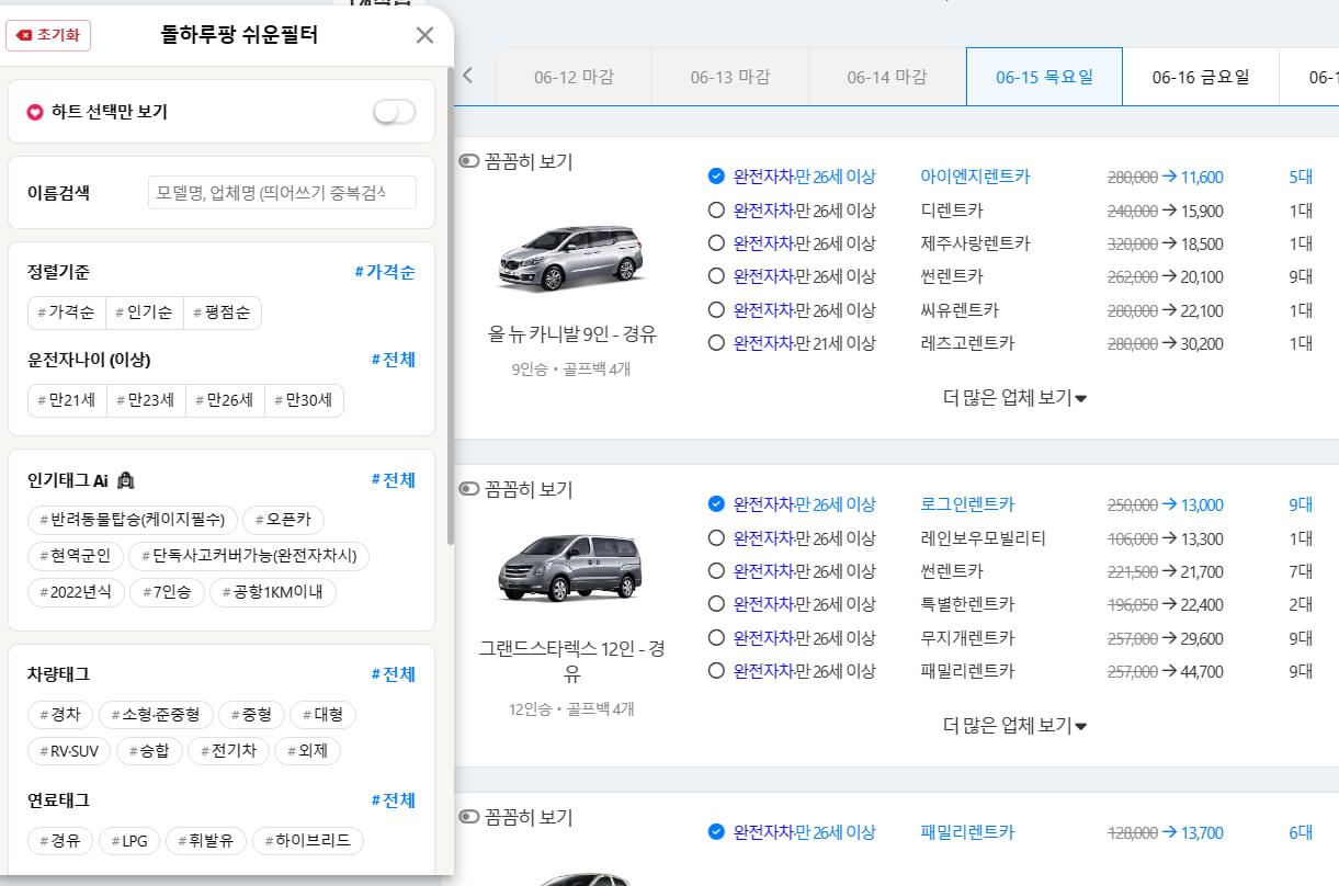 검색할 때 차량 종류 및 반려동물 탑승, 블랙박스, 후방카메라 등과 같은 세부 옵션을 선택할 수 있으며 검색 결과 꼼꼼히 보기로 해당 차량에 대한 자세한 정보를 확인할 수 있습니다.